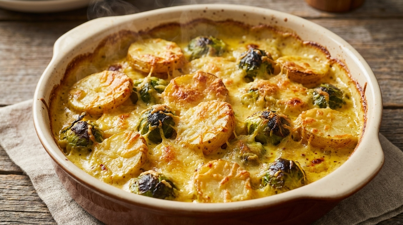 « Un gratin rustique pommes de terre-choux de Bruxelles à la moutarde qui fait aimer l’hiver même aux plus sceptiques »