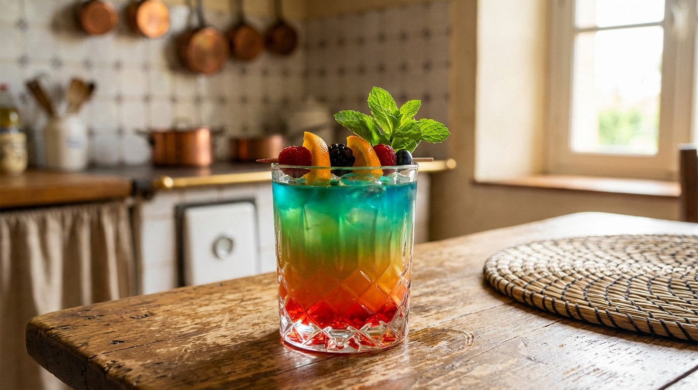 Un jour, un cocktail Arlequin vénitien : le jeu des couleurs tropicales dans un verre festif