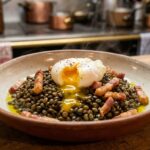 La base de cette création repose sur le caractère rustique des légumineuses. Une fois cuites à la perfection, elles offrent une mâche tendre et fondante qui appelle irrémédiablement la table. L’association avec des œufs mollets crée un contraste d’une douceur infinie, où le blanc nacré et le centre presque liquide enrobent chaque grain pour rassurer le palais.