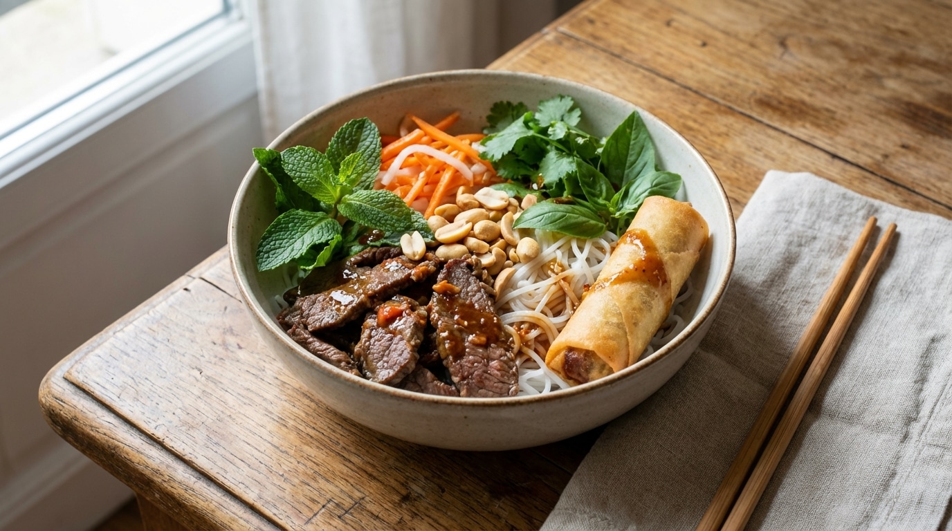 La belle surprise de cette recette, que l’on nomme familièrement le bo bun au bœuf vietnamien, vient de son incroyable contraste chaud-froid. En bouche, la viande juste poêlée et la fraîcheur intense des salades créent une explosion de saveurs sucrées et salées. Cet équilibre singulier donne un coup de fouet magistral au palais, offrant un repas extrêmement vivant à chaque coup de fourchette.