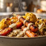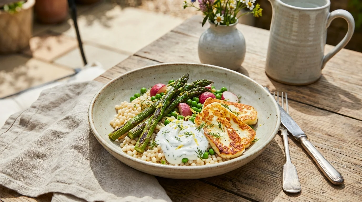 À la fin d’une journée de printemps, quand l’air sent les soirs plus longs et les fenêtres entrouvertes, un grand bowl posé au milieu de la table fait tout de suite monter l’appétit. Le couscous perlé roule sous la dent, les légumes rôtis sortent du four avec des coins bien caramélisés, et le halloumi grésille encore, doré comme il faut. Mais le vrai moment de suspense arrive avec la cuillère de sauce : une crème blanche, parfumée, qui accroche aux lèvres et réveille tout le plat. Une bouchée, et l’assiette paraît soudain plus vivante, plus fraîche, plus gourmande. Ce genre de dîner qui sent bon le fait-maison, les herbes coupées au dernier moment et les assiettes qu’on finit sans y penser.