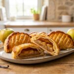 Pour façonner des chaussons nets, dérouler une pâte sur une plaque, puis découper des disques d’environ 12 cm, ou des rectangles réguliers selon l’envie. Déposer une belle cuillère de garniture au centre en gardant un bord propre, puis replier pour enfermer le cœur. Le but : une garniture bien centrée et un rebord dégagé afin que la fermeture accroche.
