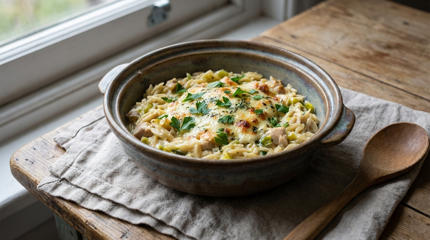 Oubliez la crème, fondez pour ce crémeux irrésistible à l’orzo, poulet, Boursin et poireaux