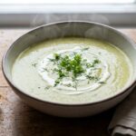 Pour accentuer la fraîcheur, rien ne vaut quelques pluches de coriandre fraîche ou de cerfeuil ciselé juste avant de servir. Les amateurs de saveurs plus relevées apprécieront un tour de moulin de poivre de Timut, dont les notes d’agrumes feront écho à l’orange présente dans la recette. Enfin, pour les plus gourmands, quelques croûtons de pain frottés à l’ail et dorés à l’huile d’olive apporteront une touche rustique et savoureuse, transformant ce velouté léger en un dîner complet et rassasiant.