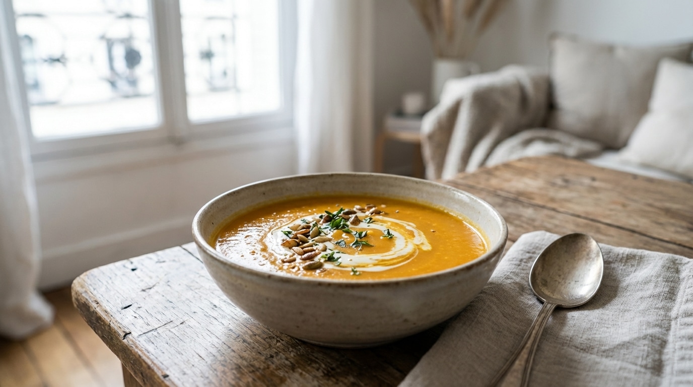 En ce cœur du mois de février 2026, alors que l’hiver étire ses dernières longueurs et que la luminosité peine encore à s’imposer, l’envie de couleurs vives et de saveurs réconfortantes se fait impérieuse dans nos assiettes. C’est le moment idéal pour transformer le dîner en une parenthèse chaleureuse, capable de faire oublier la grisaille extérieure dès la première cuillère. Imaginez un bol fumant, d’un orange éclatant, dégageant des effluves sucrés et acidulés qui embaument la cuisine et réveillent instantanément les papilles endormies. Ce velouté, véritable caresse pour le palais, célèbre le mariage heureux des légumes racines et des agrumes d’hiver. Il promet une expérience gustative d’une douceur absolue, une texture de soie et une gourmandise saine, le tout sans passer des heures aux fourneaux ni multiplier les courses compliquées.