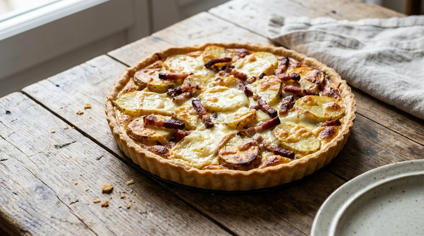 La promesse tient en une image : les saveurs tartiflette posées sur une pâte brisée croustillante, puis un passage au four pour obtenir cette croûte gratinée qui fait saliver. Le duo pommes de terre et crème porte tout, et le fromage à raclette signe la finale, bien dorée.