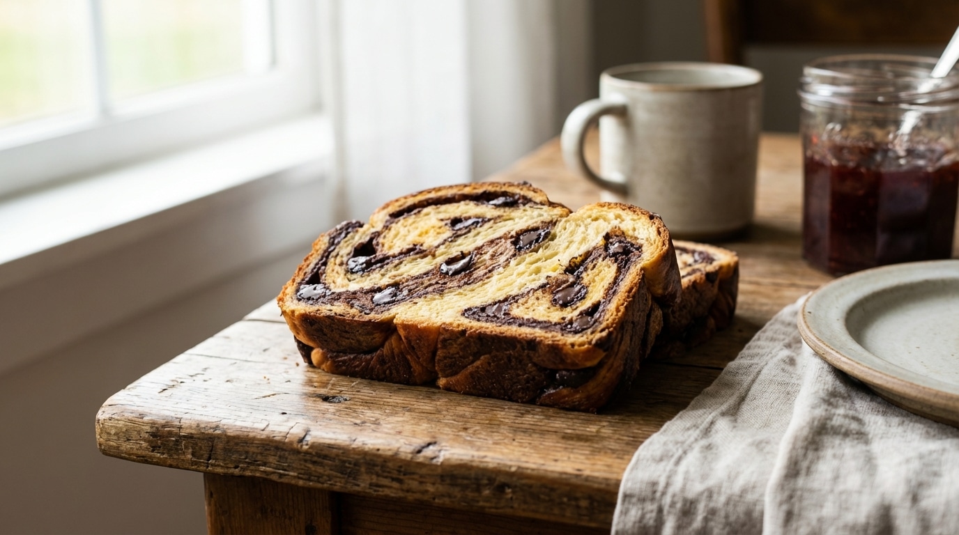 Au printemps, le dimanche matin a ce petit goût de lumière douce qui passe par la fenêtre, de table encore tiède de la veille, et de café qui coule pendant que la maison s’étire. Dans l’air, une odeur de beurre et de chocolat prend vite le dessus, comme une promesse. Une viennoiserie bicolore arrive, bombée, brillante, et la lame du couteau s’y enfonce avec ce léger soupir de mie filante. La première tranche tombe, dévoile un marbrage clair et sombre, et là, tout le monde se tait. Parce que ça craque, ça fond, ça sent la brioche de boulangerie, mais avec un relief cacao plus profond et des éclats de chocolat qui accrochent sous la dent. Le genre de pièce à poser au centre, et à regarder disparaître.