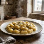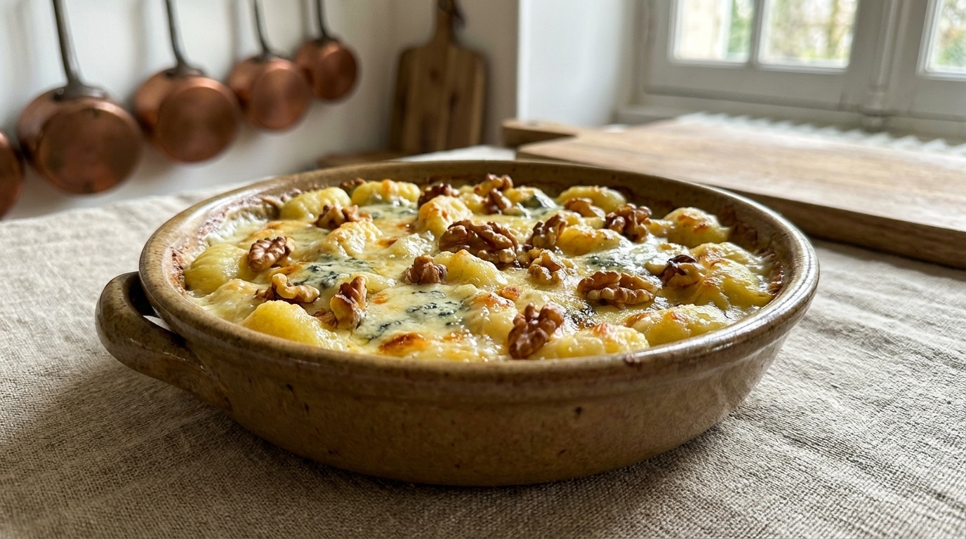Quand le printemps s’installe doucement, les soirées gardent encore ce petit frisson qui appelle un plat chaud, généreux et réconfortant. Dans la cuisine, l’odeur du fromage qui fond et du beurre qui crépite suffit à rassembler tout le monde autour du four. Le gratin de gnocchis coche toutes les cases : une surface dorée qui craque sous la cuillère, un cœur qui nappe et qui file, et ce contraste irrésistible entre moelleux et croquant. Le bleu apporte une puissance salée, presque noisettée, pendant que la crème enveloppe chaque gnocchi d’une sauce épaisse. Et les noix, toastées juste ce qu’il faut, signent la dernière note gourmande. Ici, tout se joue sur un geste simple, discret, mais décisif : un mélange fait avant d’enfourner, à froid, pour obtenir ce coulant parfait qui fait dire, dès la première bouchée, que le gratin est exactement comme on l’espérait.