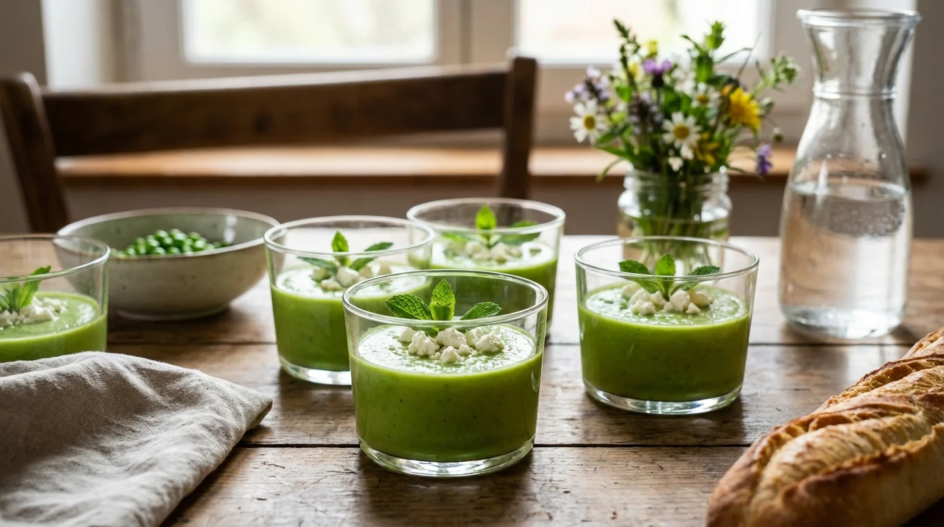 Quand le printemps s’installe, l’apéro prend des airs de terrasse, même à l’intérieur : verrines alignées, glaçons qui tintent, herbes fraîches qui parfument la cuisine. Dans cette ambiance, une seule cuillère peut voler la vedette à tout le plateau. Un velouté de petits pois servi bien froid, d’un vert tendre et franc, arrive en verrines comme un shot gourmand. La première sensation est douce, presque sucrée, puis une fraîcheur vive s’invite, et tout de suite l’envie d’y replonger. Et au moment où le dessus se couvre d’une touche salée et blanche, le contraste devient irrésistible. Résultat : les autres verrines restent sagement à leur place, pendant que celle-ci disparaît, une à une, sans faire de bruit.