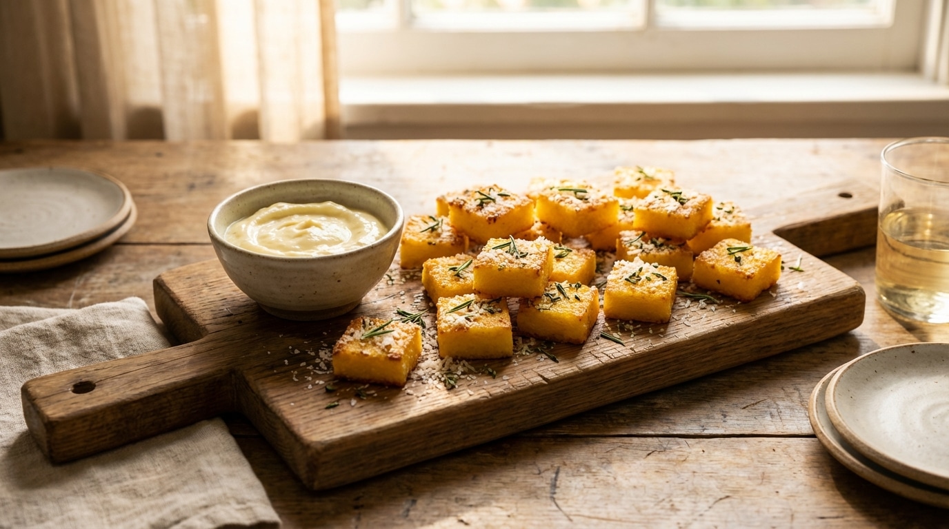Version méditerranéenne : ajouter du romarin finement haché dans la polenta, glisser quelques olives noires émincées, puis dorer à l’huile d’olive. Le tout devient plus parfumé et plus salé, superbe avec une tapenade ou un dip tomate.
