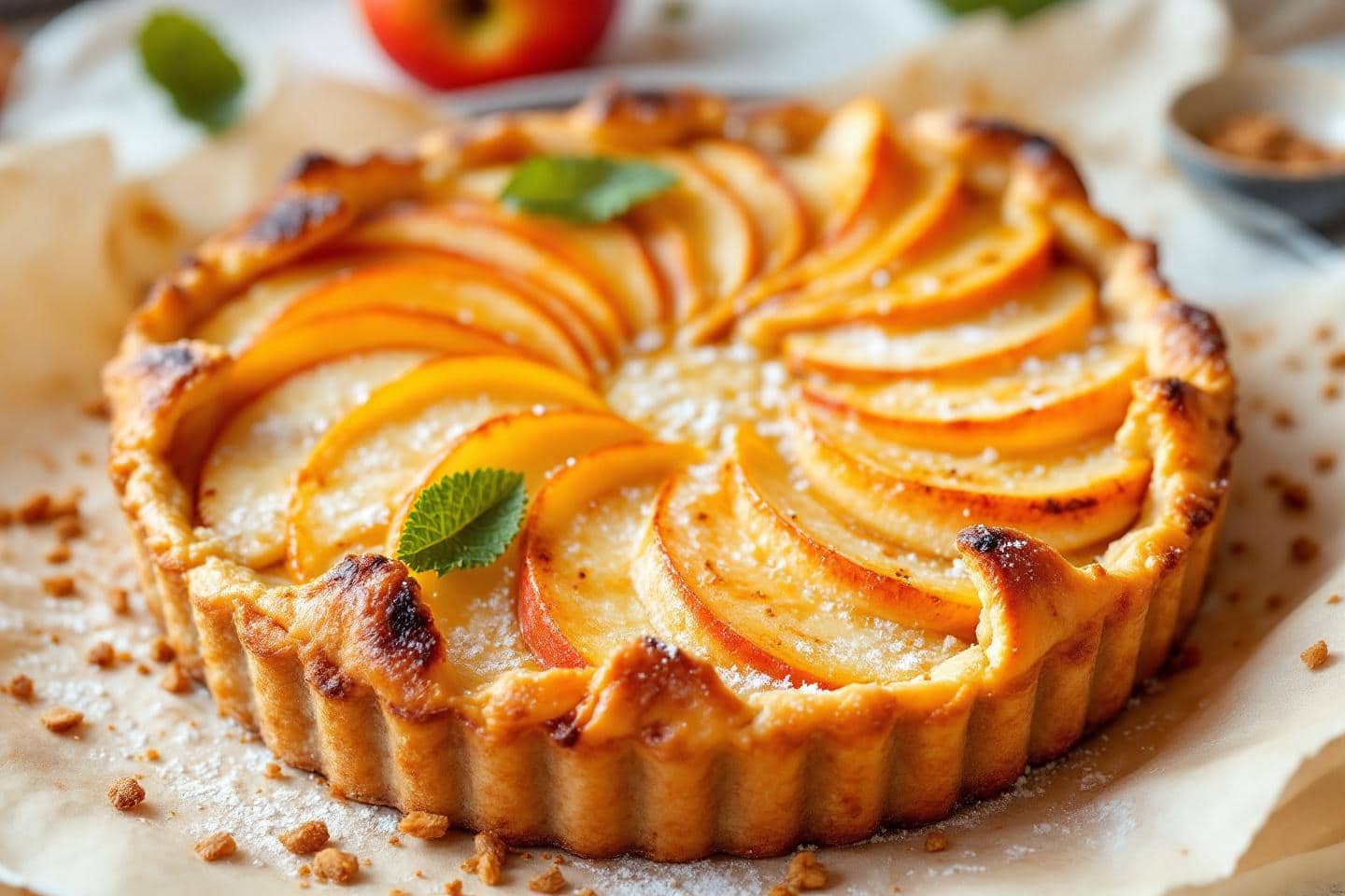 La tarte dévoile tout son croquant à la sortie du four, mais elle reste délicieuse le lendemain, légèrement réchauffée quelques minutes au four à 160°C : la pâte redevient alors légèrement craquante, tandis que les pommes prennent des notes encore plus confites. Pour préserver la fraîcheur et la texture, privilégier une conservation sous cloche à température ambiante pendant 24 heures, ou au réfrigérateur si elle doit durer davantage – dans ce cas, prévoir un bref passage au four avant de servir. À partager en parts généreuses avec un thé fumant ou un cidre brut… effet « cocooning » garanti dès la première bouchée.
