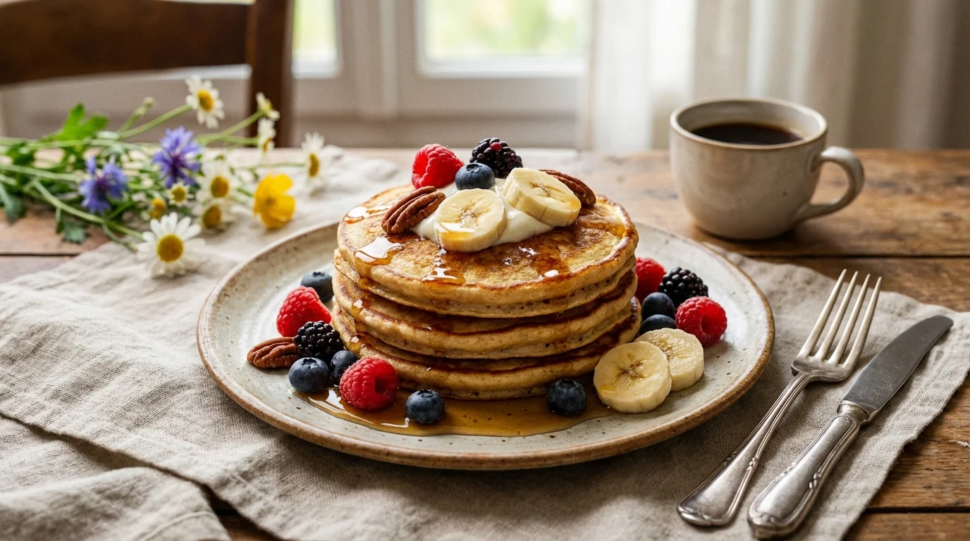 La base qui gonfle repose sur des flocons d’avoine mixés finement et une levure qui fait lever la pâte. Les œufs et le lait apportent le liant et ce côté souple, tandis qu’une banane très mûre donne la douceur et la texture. Les options restent libres, selon l’humeur du matin.
