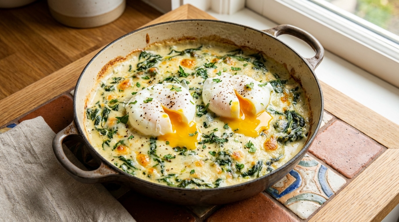 Chaque cuillerée mélange l’amertume légère des épinards, la richesse du jaune d’œuf coulant, la douceur crémeuse de la béchamel et le caractère salé et un peu noisette du gruyère. Ces saveurs opposées créent un équilibre que rien ne perturbe. La muscade joue son rôle discret mais essentiel, unissant tous ces éléments dans une harmonie souvent oubliée des tables modernes.