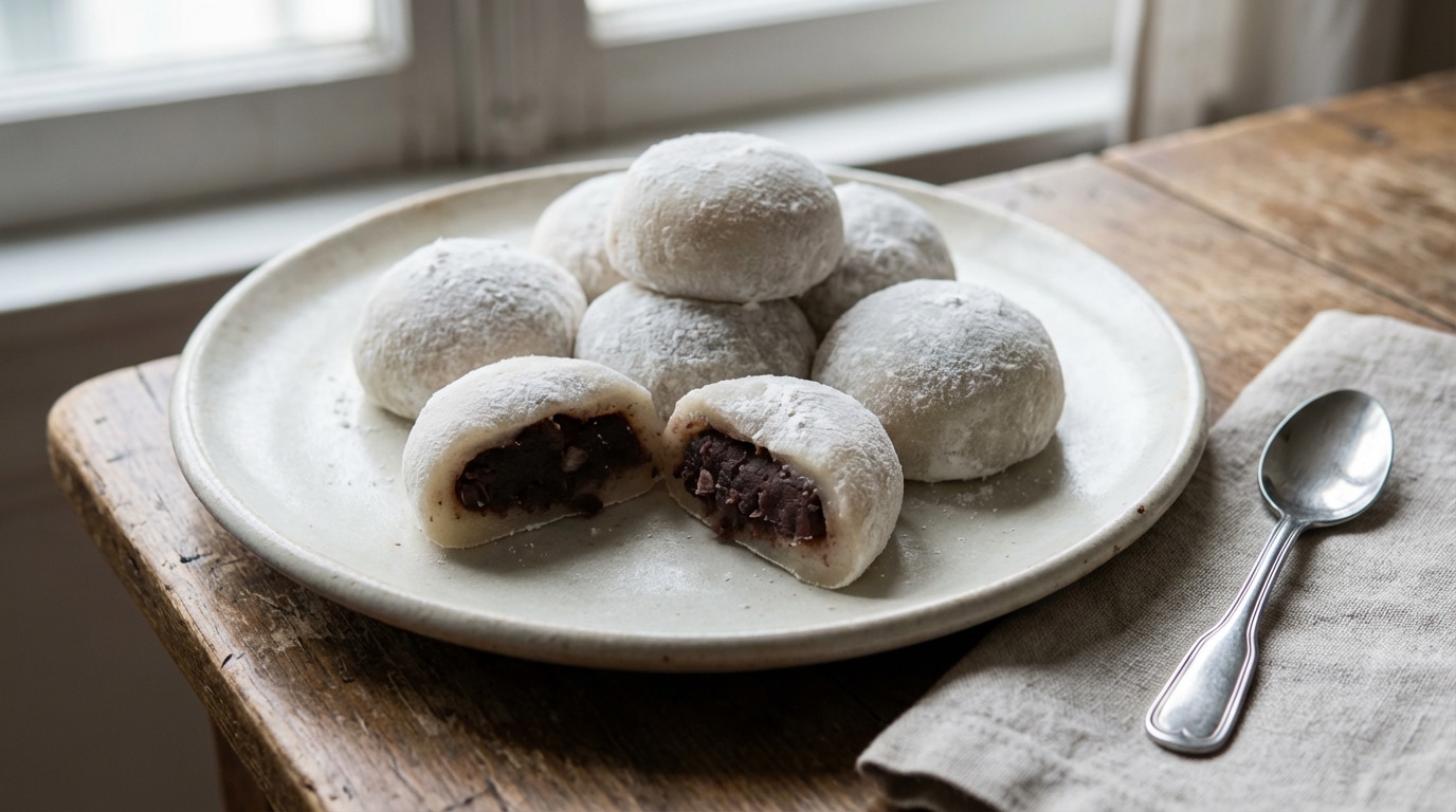 Pour le cœur, l’anko reste la garniture la plus classique : une pâte de haricots rouges sucrée, douce et ronde en bouche. Sans anko, une ganache chocolat ferme, une pâte de sésame noir sucrée ou une purée de châtaigne bien dense donnent un résultat très pâtissier, à condition de pouvoir se rouler en petites boules.