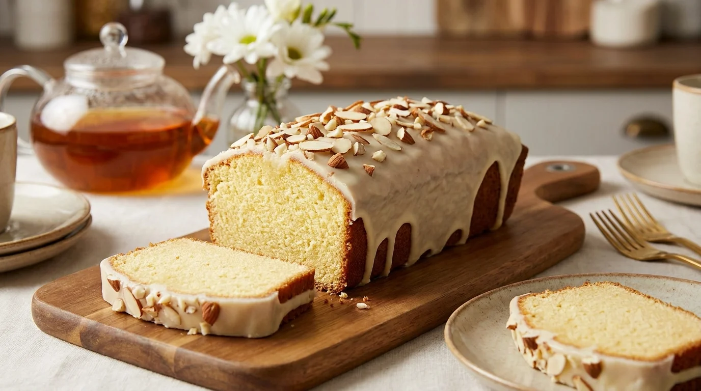 Pour le glaçage, le sucre glace se mélange avec 2 à 3 cuillères à soupe de lait jusqu’à une texture lisse, puis l’extrait de vanille et la poudre d’amande s’ajoutent. Le glaçage se verse sur le cake refroidi, se lisse si besoin, puis passe au frais pour figer. Le résultat doit être brillant et nappant, sans couler en flaques.