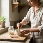 Le départ se fait comme un parfum : lait chauffé à 30 °C, puis infusion des grains et gousses hors du feu pendant 30 minutes. Les gousses s’enlèvent ensuite, et le lait garde une odeur nette, profonde, presque crémeuse.
