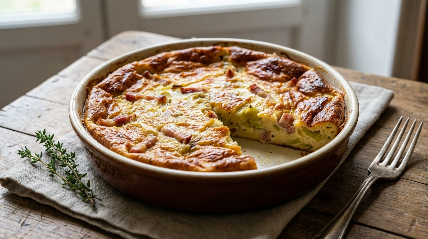 Lorsque les soirées de février s’étirent et que le froid persiste au-dehors, la cuisine devient le refuge idéal pour préparer des mets réconfortants qui embaument la maison. Rien ne vaut le plaisir simple d’un plat doré sortant du four, promettant une texture à la fois moelleuse et fondante, capable de rassembler petits et grands autour de la table. Ce clafoutis aux poireaux et aux lardons incarne cette gourmandise hivernale par excellence : une recette rustique, sans prétention, mais d’une efficacité redoutable pour régaler les papilles en quête de chaleur. Oubliez les préparations complexes ou les temps de repos interminables ; ici, la magie opère grâce à l’alliance intemporelle du fumé des lardons et de la douceur sucrée du poireau, le tout enrobé dans une pâte onctueuse qui dore doucement. C’est la promesse d’un dîner réussi, économique et savoureux, où le plaisir de manger prime sur tout le reste.