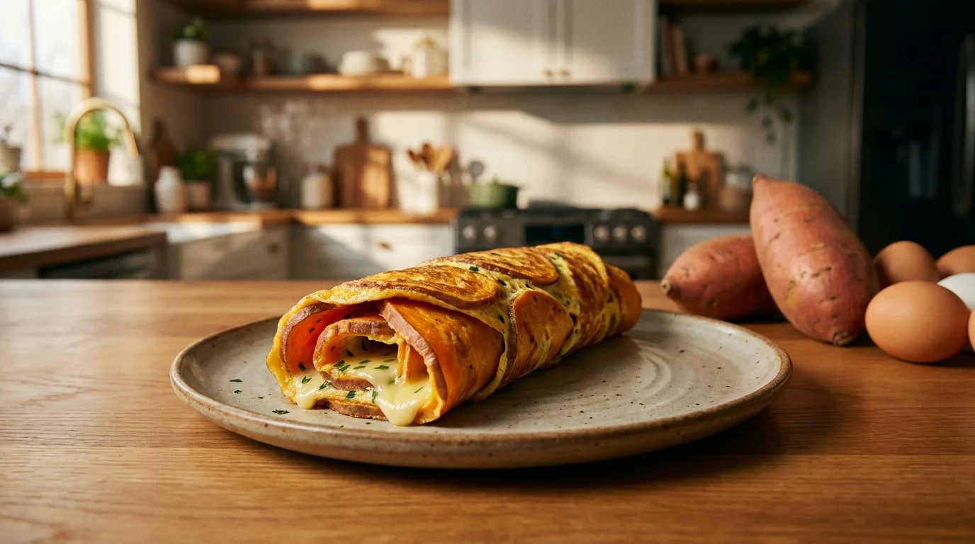 Tout part d’un duo qui ne déçoit jamais : **la douceur naturellement sucrée** de la patate douce et **le moelleux des œufs**. En lamelles très fines, la patate douce devient presque fondante, avec des bords légèrement dorés qui rappellent les pommes de terre sautées, mais en plus délicat.