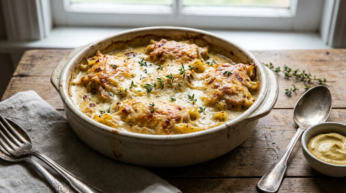 Ce gratin de pâtes au poulet a tout d’un plat de brasserie : une sauce crème-moutarde bien nappante, un dessus crousti-fondant et des parfums qui remplissent la cuisine. Le “condiment magique” se dévoile vite : une moutarde douce, juste assez présente pour réveiller la crème et donner une vraie signature au plat.