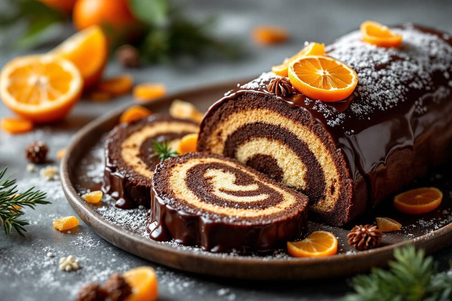 Pour une touche festive, parsemer la bûche de zestes de clémentine fraîchement râpés et ajouter des écorces confites, à la fois décoratives et croquantes sous la dent. Quelques perles de sucre argenté apportent l’éclat des Fêtes tandis qu’un léger saupoudrage de cacao amer fait ressortir la profondeur du chocolat. Un brin de branches de sapin ou quelques groseilles fraîches déposés en bord d’assiette subliment l’ensemble pour un effet tableau de Noël élégant et gourmand.