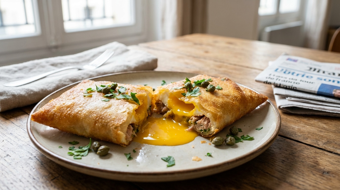 Au tout début du printemps, lorsque les journées s’allongent et que l’on recherche des plats qui offrent du croquant sous la dent, la brick tunisienne à l’œuf s’impose naturellement : une enveloppe fine et dorée, des parfums d’herbes fraîches, et cet instant unique où le jaune éclate, chaud et lumineux. Pour un déjeuner sous le soleil, un dîner entre amis ou même lors d’un apéritif qui se prolonge, elle séduit immanquablement grâce à son croustillant irrésistible et son cœur fondant. Toute la maîtrise réside dans un geste précis, presque chorégraphié, et surtout dans une cuisson rapide qui ne tolère aucune erreur : quelques secondes supplémentaires et le jaune fige. Quand le timing est parfait, la brick devient spectaculaire, proposant une farce salée et iodée parfaitement associée à la douceur de l’œuf. Voici la méthode détaillée pour retrouver, à chaque réalisation, cet équilibre entre une croûte ultra croustillante et un jaune onctueusement coulant.