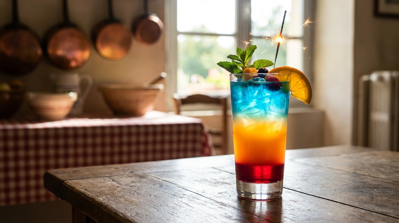 C’est ici que la magie opère. L’utilisation conjointe du sirop de grenadine et du curaçao bleu n’est pas anecdotique. Au-delà de leurs saveurs respectives de fruits rouges et d’orange amère, ils sont les architectes visuels de la boisson. La grenadine, par sa densité, va tapisser le fond du verre d’un rouge intense. Le curaçao, ajouté en touche finale, viendra contraster avec le jaune orangé du jus pour créer des nuances allant du vert émeraude au bleu profond. C’est cette combinaison inattendue – rhum blanc, jus d’orange, curaçao bleu et sirop de grenadine – qui assure un effet tricolore flamboyant digne d’un feu d’artifice.