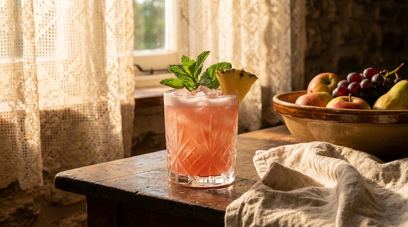 Pour garder l’esprit du Sling sans alcool, l’idée est de conserver la structure : fruit, acidité, herbes, amers. Une base simple fonctionne très bien : jus d’ananas, jus de citron vert, une touche de grenadine, et quelques gouttes d’amer sans alcool si disponible. À défaut, une infusion très concentrée d’épices type cannelle et clou de girofle (refroidie) peut apporter un relief proche de l’intention, sans singer l’original.