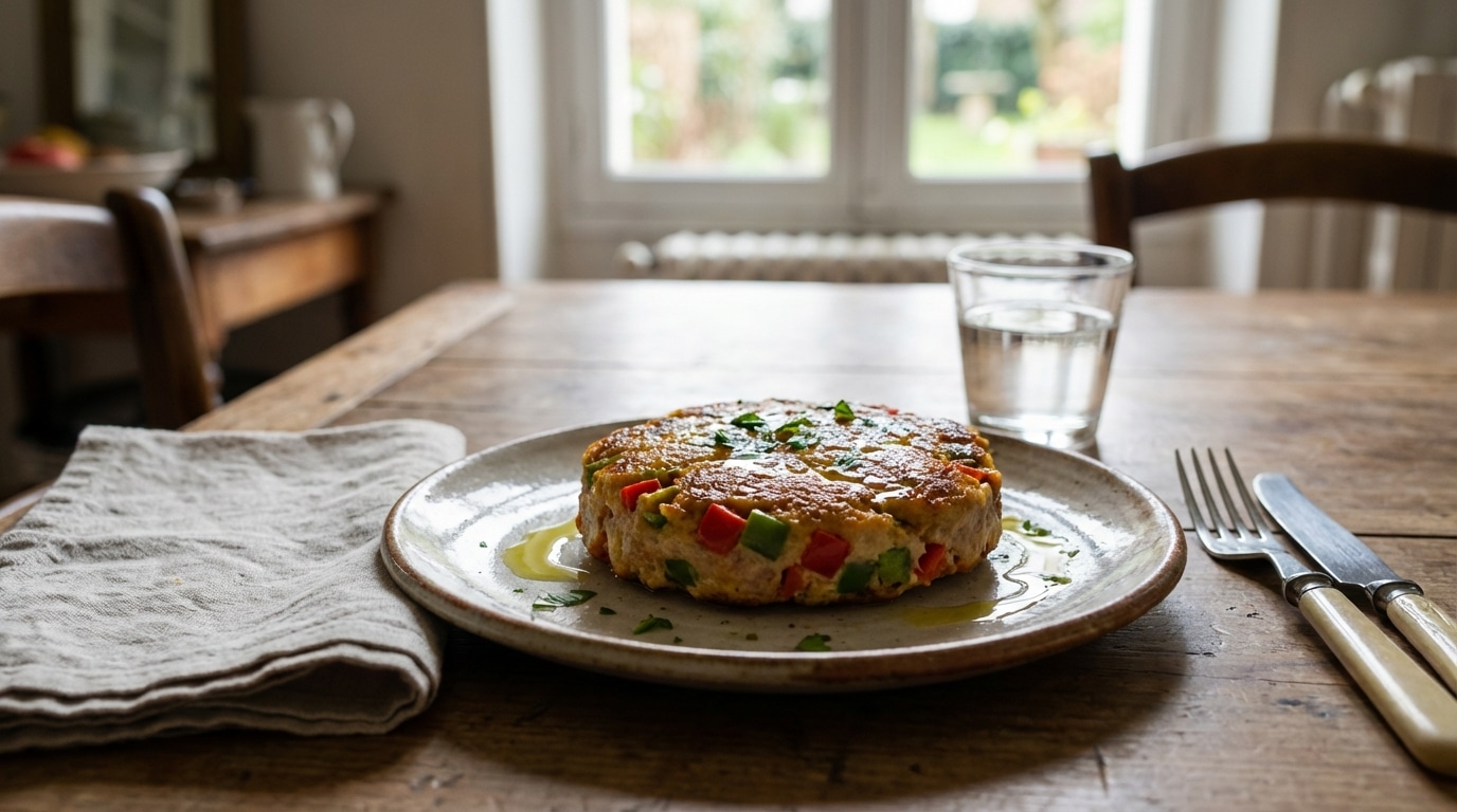 Le moment véritablement décisif se déroule ensuite directement sur le feu, nécessitant une chaleur modérée sur la poêle avec quatre minutes par face pour faire joliment blondir le tout. La magie opère alors en réunissant délicieusement cette liste de poivrons en dés poêlés, thon égoutté, œufs, farine, galettes dorées 4 min par face, assurant un rendu visuel des plus appétissants qui fait immédiatement monter l’eau à la bouche.